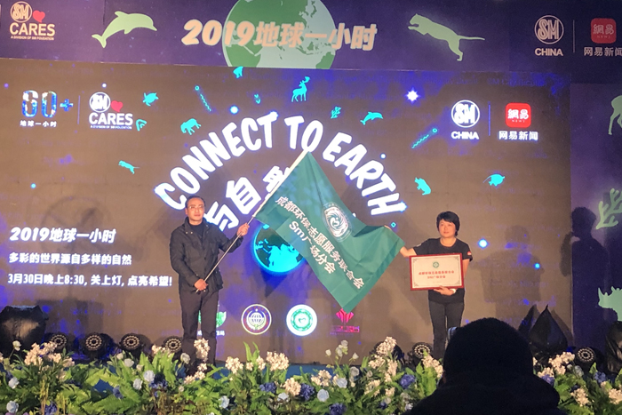 四川新闻网成都3月31日讯(王茜)昨(30日)晚,在2019年地球一小时活动现场,成都SM广场正式加入到成都环保志愿服务联合会(简称:联合会)的行列中。来自成都市成华区生态环境局、成都市成华区科学技术协会的嘉宾,与SM广场商场区域营运经理Ms. Tiffany 、助理商场经理刘万山先生、高级招商经理Ms Kashmir以及租户代表,以及500多位热情市民朋友一起见证了这一大善举。当晚8时许,成都环保志愿服务联合会副主席卢永洪先生将联合会分会旗帜及牌匾授予SM广场商场区域营运经理王锐女士。