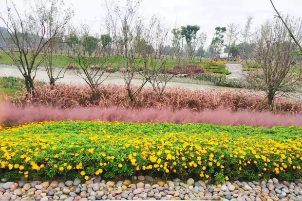 通过拆违增绿,河岸一侧一段200米左右的景观示范段已基本建成。这里种植了香樟树、桉树、银杏、红枫等具有较高观赏性的植物,高大的乔木和低矮的灌木相互映衬,使绿化带既有连续,又富有变化。正值秋季,连绵成片的乱子草和牧地狼尾草引人入胜,粉紫色的梦幻色彩,极具诗意。