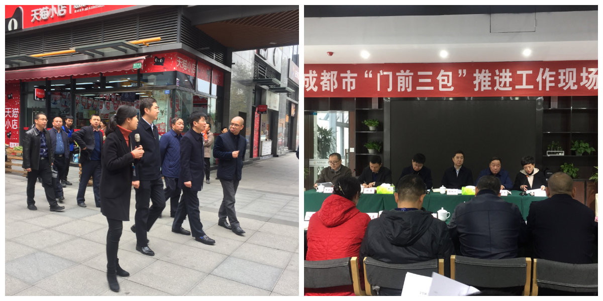 何汝云一行人参观了新尚天地商业街街区示范店、党员示范店,听取了温江大学城社区关于“1+1+4+N”“门前三包”治理新途径主题展板讲解。在经验交流会上,市“门前三包”推进办通报了近年“门前三包”工作开展情况,各区市县进行了交流发言。