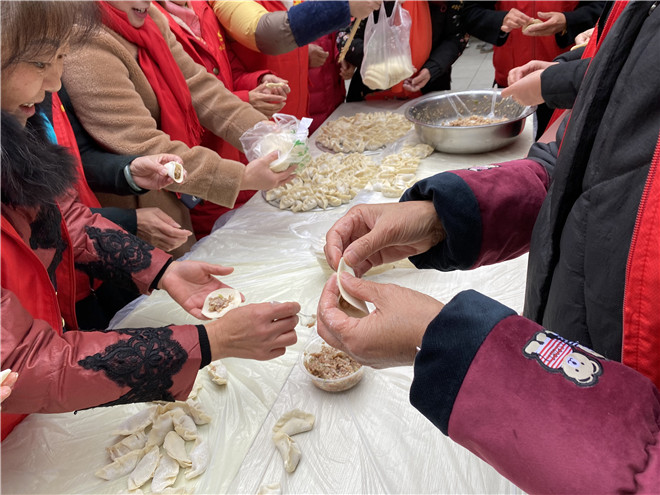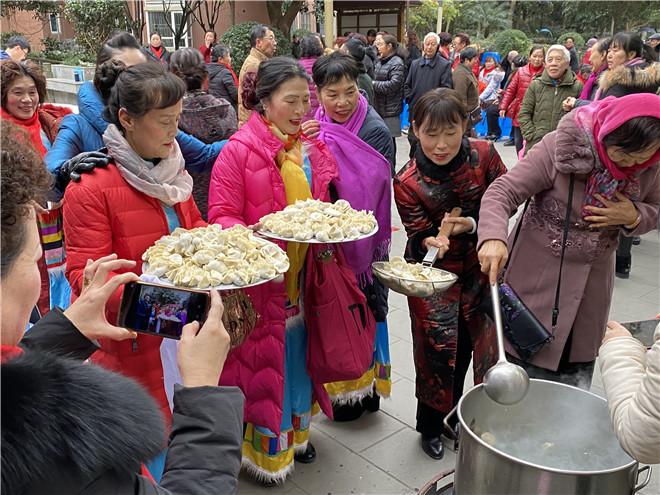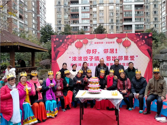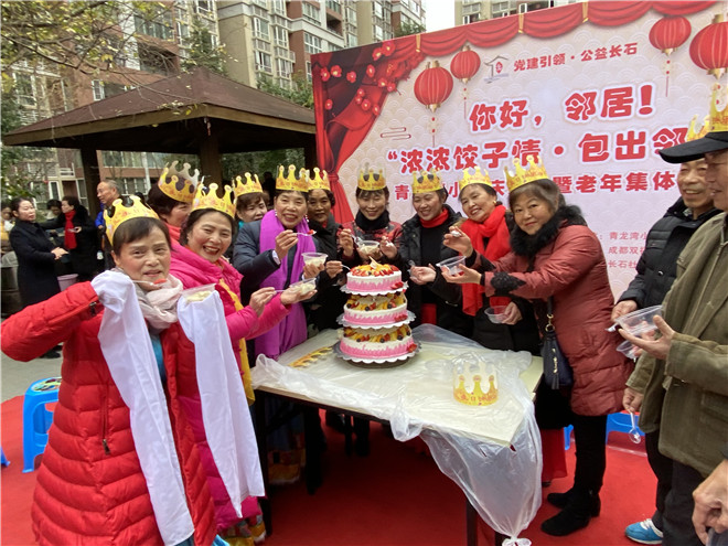 活动中,居民们分工协作,切菜、调馅、包饺子、布置舞台,个个动作娴熟,大家有说有笑,忙得不亦乐乎。就在大家忙着把饺子下锅的同时,舞台上,13位寿星正在一片欢快的音乐声中登场,他们坐在椅子上接受着来自左邻右舍的祝福,共唱生日祝福歌,共享生日蛋糕,共同品尝邻居们送上的饺子,每个人的脸上都洋溢着幸福的微笑。