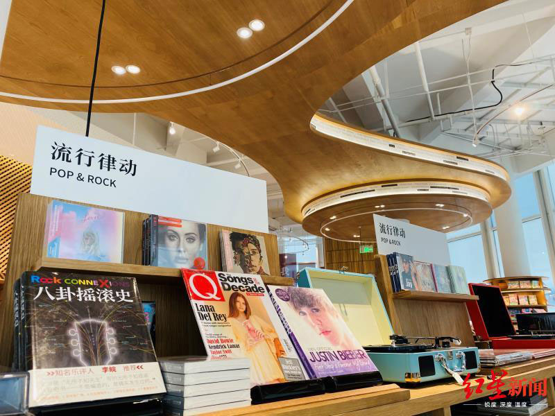 推开书店的大门,纯白色落地窗和纯木色书架的搭配,令人即刻变得宁静温暖。书店第一层的音乐元素无处不在。木桌上摆放着不常见的黑胶唱机和唱片等,背面则摆放了披头士乐队、周杰伦、张国荣、泰勒·斯威夫特等国际著名歌手的音乐产品。
