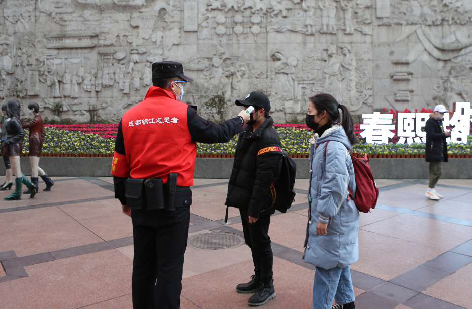 2月3日,成都市春熙路,街道工作人员对来往的人们进行体温检测