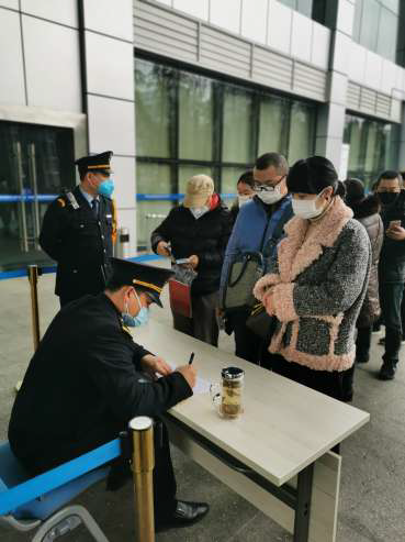 2月3日,成都市政府政务服务中心房产分中心门前,办事群众在有序排队测温登记