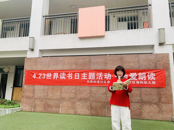 天府街道社区教育分校、海科幼儿园联合在幼儿园操场开展以“为爱朗读”为主题的活动,50余名教职工参加。