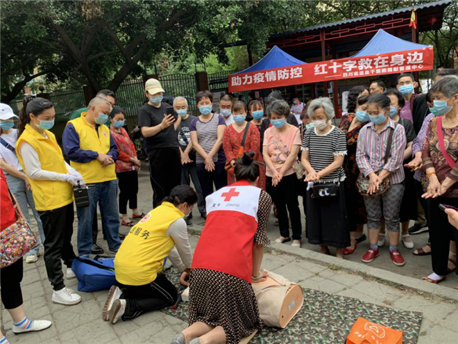 培训现场,居民积极地围在志愿者身边,认真学习灭火器的使用方法,并在志愿者指导下进行灭火。志愿者现场演示教学,遇到落水者如何进行成人徒手心肺复苏操作、儿童成人气道异物阻塞窒息解除操作,并手把手在场居民进行急救技能培训,帮助居家提高自救互救能力。之后的有奖竞答在日常急救知识的基础上,加入了疫情相关的知识点。经过上午的学习,居民都轻松地给出了正确答案。