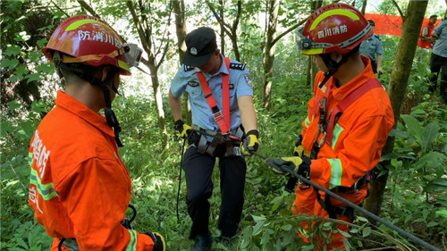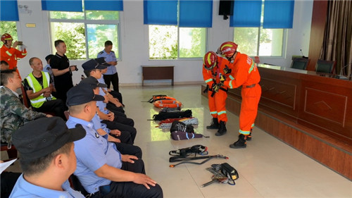 培训中,教官首先进行理论讲解,向全体参训人员讲解了在解救被困游客时应注意的事项。随后,教官现场实地演示讲解了各种救援装备的使用方法和步骤,并着重介绍了各绳索组件的构成和作用和绳索上升和下降的规范步骤。最后,参训民辅警按照教官讲解的内容,开展模拟训练,分组对救援装备进行了实际操作,教官在一旁就操作中存在的问题逐一讲解纠正。