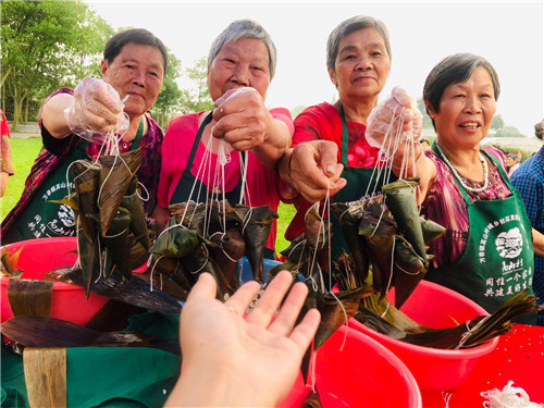 齐包粽子,互送祝福,新高山人们把自己热情的性格、真挚的乡心毫无保留地用情注入到每一个“特色DIY粽子”中,并将其与自写祝福语、微信号放入礼品盒和手提袋中,等待另一个“有缘人”接受端午神秘祝福,互加好友,共话乡邻情。