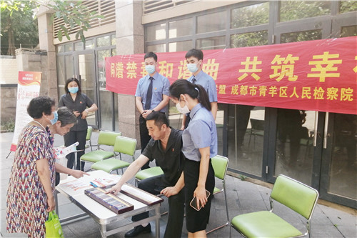 四川新闻网成都6月24日讯 为进一步提高社区居民群众禁毒、防毒意识,营造良好的社会禁毒氛围。2020年6月24日,青羊区人民检察院到少城街道祠堂街社区开展“626国际禁毒日”宣传活动。