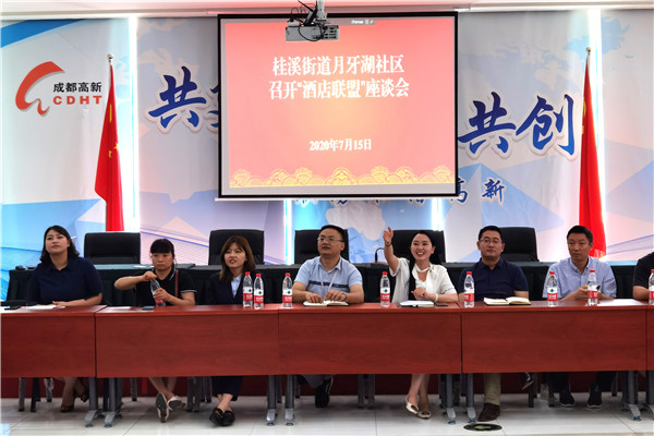 四川新闻网7月16日讯 为充分撬动产业社区资源,助推辖区酒店行业复产复苏,7月15日,成都高新区桂溪街道月牙湖社区组织辖区43家酒店召开了“酒店联盟”复产复苏座谈会,这是特殊时期月牙湖社区组织发起的一次复苏辖区酒店行业经济的具体行动。