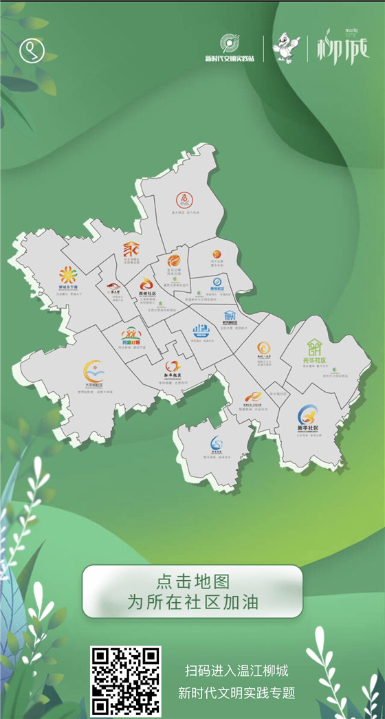 活动最大亮点就在于通过线上网络平台与社区居民形成双向互动,每位居民可以通过扫描二维码一键进入柳城街道新时代文明实践专栏,在“点亮柳城”子频道中的《我是柳城人,点亮家园等你来》文章里,点击“为你所在的家园投票”按钮,即可瞬时跳转到柳城街道19个社区的高精度地图上,每个社区的地图上都可以看到社区名称、社区LOGO和社区精神。居民朋友结合社区文明实践工作开展情况,点击地图上自己所要加油的社区,即可为社区创建新时代文明实践投票。当社区票数达到设定数值以后,地图便会从白色变成红色,社区瞬间被“点亮”。