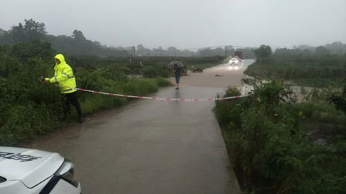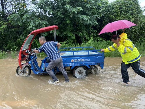 暴雨导致辖区部分路面积水过深,新兴街道防汛一线工作人员已在第一时间到位,在路面积水处疏导交通,帮助受困群众通过积水路段,并在严重积水道路段外围设置管制点,引导车辆提前绕行通行。