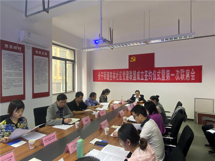 四川新闻网成都9月25日讯 为进一步加强党的全面领导、整合党建资源力量、提升社区发展治理水平,形成党建责任共担、党建工作共议、党建实事共做、党建难题共解的良好局面。2020年9月24日上午,永宁街道杏林社区党委组织召开党建联盟签约仪式暨第一次联席会议。会议由杏林社区党委书记张兴平主持,街道党工委副书记、纪工委书记胡殿全出席并讲话,街道党工委委员于小蓉、永宁派出所、司法所、街道党群办等相关负责人参加了会议。