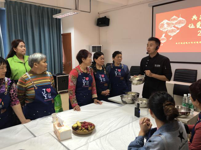 本次活动首先由永宁街道卫健负责人为大家致辞,表达了党委政府和计划生育协会对辖区失独家庭的关心关怀,引导他们要勇敢坚强地面对生活,以阳光的心态过好每一天。接下来就开始了烘焙活动。小组成员五人分为一组,桌上摆放着香喷喷的面团、馅料及工具。手工制作开始前,烘焙老师为大家演示了蛋黄酥的制作方法,从称量面团到擀皮,从包馅到刷蛋液,不到十分钟皮薄馅靓的蛋黄酥就做好了。虽然都是第一次动手做蛋黄酥,但大家都做得有模有样的,当看到一个个漂亮的蛋黄酥从自己手中诞生,看着自己的劳动成果,大家脸上露出愉快的笑容。