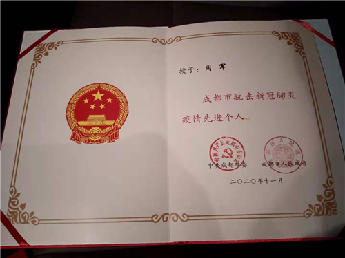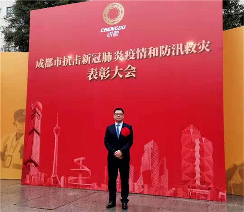 温江区涌泉街道社区卫生服务中心副主任、中医师周军在会上荣获成都市抗击新冠肺炎疫情先进个人、优秀共产党员称号。(陈凡坪)