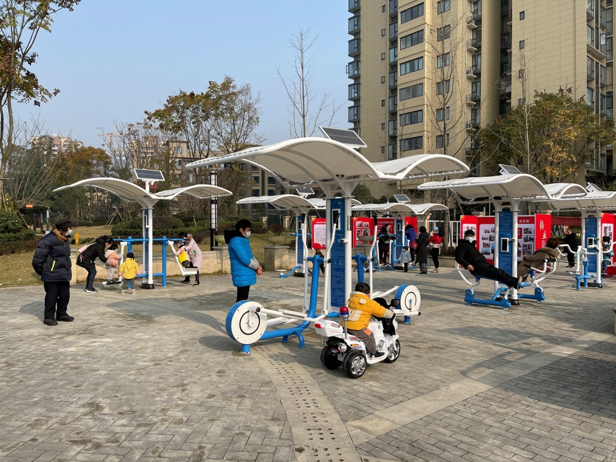 光华之心广场地处温江区公平街道黄金地段,附近有光华之心、千禧河畔、森宇花园等多个商业楼盘,覆盖居民近2万人,但缺乏运动设施,不能满足居民的健身需求。在温江区文体旅局的大力支持下,公平街道积极配合,在广场右侧安装了智能转腰器、智能自重背部训练器、智能推举训练器等全区首批智能化、多功能全民健身器材。该设备使用太阳能供电,微信扫描二维码后,器材显示屏及智能手机能同步显示运动时长、次数、消耗卡路里,在停止运动5秒后器材扬声器会播报本次运动信息。