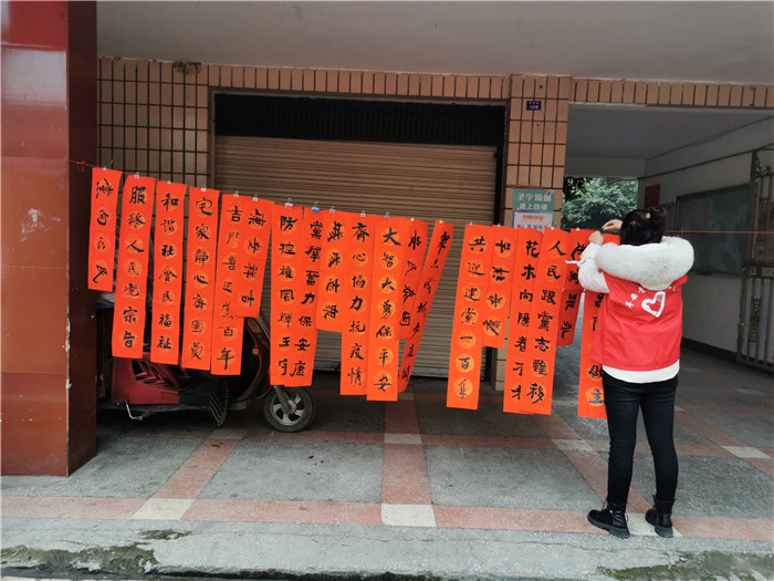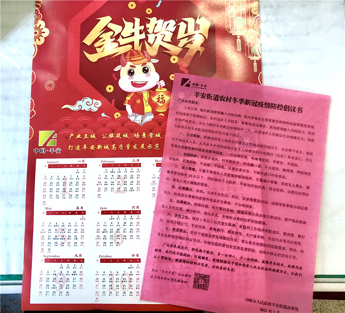 四川新闻网成都1月27日讯 春节将至,正是喜庆祥和之时,然而当前新冠疫情防控形势依然严峻复杂,各级各单位均倡导“非必要不返乡”“减少聚集、聚餐活动”……为了让新春佳节不减热闹喜庆的节日氛围,又能提高辖区内群众防疫自觉与能力,邛崃羊安街道新时代文明实践志愿者们走上街头、走进农村,向群众宣传新冠疫情防控知识的同时,也为他们送去精心设计的新年日历和墨香芬芳的定制春联。