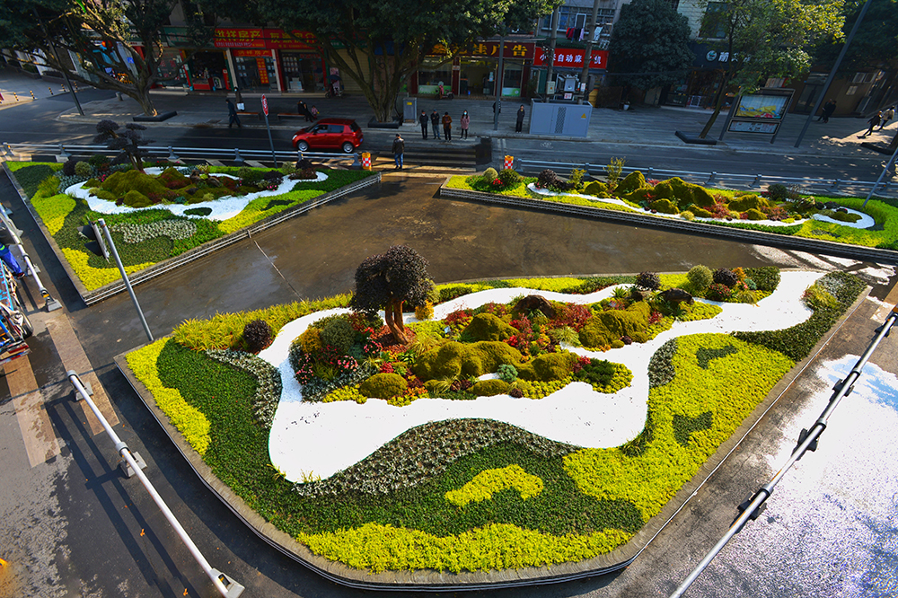川藏路南昌路节点——心语花园打造,挖掘场地价值,运用熊猫和灯笼元素,形成合家欢熊猫组景绿雕,利用特色黄葛树,结合夜景光彩,营造繁华闹市中的方寸之美,承载居民祈福心愿,寄托对新年生活的美好期盼。