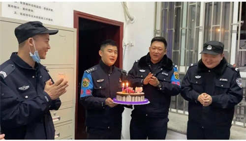 一天的工作下来,回到派出所杨硕彦已有些疲惫,当看到同事为自己准备的这场简单温馨的生日会,让生日当天一直坚守在岗位上的杨硕彦十分感动。