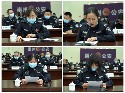 指挥中心民警马玲、看守所辅警苟志学、交警大队城区中队辅警张莉、出入境管理大队辅警陈宇,四位女警代表从不同侧面讲述了自己的公安工作经历和成长历程,抒发了“爱岗敬业、履职尽责”的决心。并鼓励全局女民、辅警同志们继续发扬“巾帼不让须眉”的精神,脚踏实地,发挥自身优势,以更加饱满的热情、更加昂扬的斗志投入到公安工作中去,为崇州公安事业增光添彩。