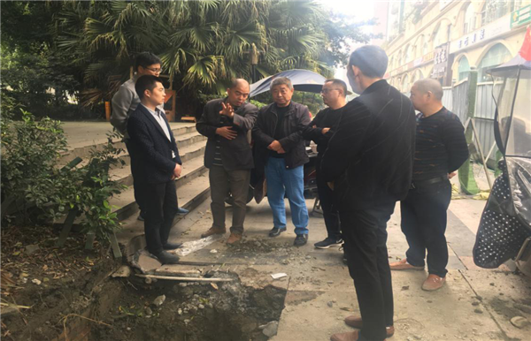 柳城街道依云镇小区党支部、业委会、物业企业、监事会协调解决地面下陷问题(蒋平 摄)
