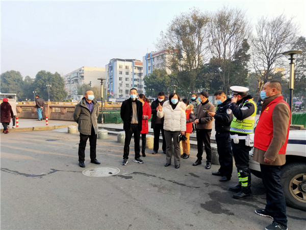 区交警大队、柳城街道、东街社区党委、公园壹号小区党支部、业主代表对小区门口道路车辆逆行,经常造成拥堵的问题进行协调(许昌茂 摄)