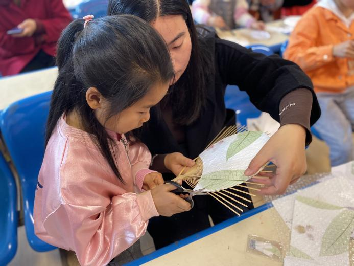 活动开始前,沈老师首先向大家介绍了团扇的发展历史,并讲解了中国传统团扇历来是文人士大夫把玩的怀袖雅物,紧接着老师向大家演示了传统团扇的制作方法。随后在老师的指导下,大家开始一步步制作团扇,相互讨论,互相帮助,摆造型、涂胶水,忙得不亦乐乎。扇面粘贴完成后,孩子们满怀欢喜地展示自己的作品,分享自己制作的经验。活动结束后,孩子们进行了合影,一个个都展示着自己的团扇,个个脸上都洋溢着幸福的笑脸,家长们纷纷表示,此次活动不仅仅是使孩子们对于传统文化知识有了一定的了解,还提高了他们的动手能力,提高了绘画技巧、艺术修养和审美情趣,还为孩子和家长之间提供了亲子学习时间,期待下次还能和孩子们一起参加此类活动。