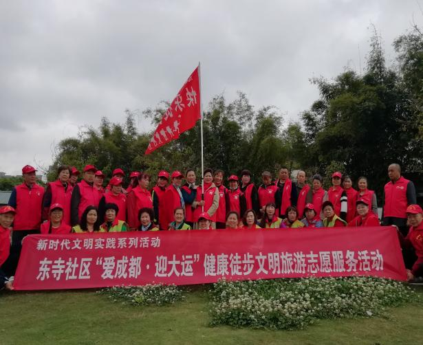 四川新闻网成都4月12日讯 为进一步培育和践行社会主义核心价值观,倡导文明新风尚,努力推动文明旅游、绿色出行宣传工作常态化。2021年4月11日上午,东寺社区组织辖区志愿者开展“爱成都·迎大运”健康徒步文明旅游志愿服务活动。