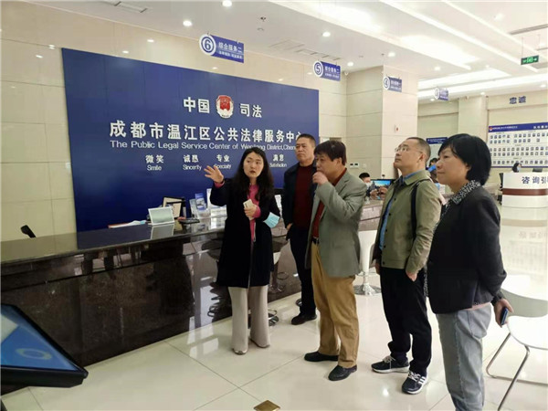 在温江区公共法律服务中心大厅,史教授一行参观了服务区、等候区、办公区等区域,详细了解了公证服务、法律咨询、法律援助、人民调解各服务窗口的运作模式和作用发挥,重点听取了法治温江大数据平台、检索平台情况介绍,并现场操作体验了律师检索功能。