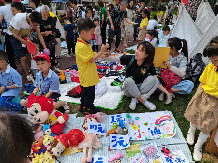 现场,最受小朋友热捧的便是亲子市集了。40顶白色小帐篷下面都“藏”着40组精灵的“小老板”,他们将自己的书籍、玩具、小手作等各色小商品摆出来义卖,“阿肯百货”“览览杂货铺”“天糖婉小屋”……店铺林立,小朋友们各显身手,家长全力支持陪伴。亲子市集截稿前其中25家摊位已义卖1145元,并捐入“横桥社区发展治理专项基金”,会用于支持社区居民发起的各项公益小项目。