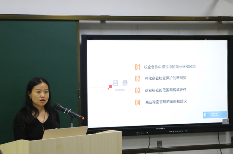 四川鼎众律师事务所律师王潇鸿发表了“企业科技创新和大学科技成果转化之商业秘密保护”主题演讲,她提出,商业秘密是一切IP保护的起点,商业秘密的保护不是单纯的法律工作,商业秘密的构建和保护是以商业秘密的保护为目标任务的管理体系等三个新观念,对校企合作创新创业具有建设意义和重要作用。