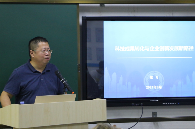 成都市生产力促进中心副主任龙飞发表了“科技成果转化与科技企业创新发展新路径”主题演讲,他介绍了新时代下科技创新的主要内容,以及成都市科技创新体系的构建,解读了科技成果转化法及成都市主要科技成果转化支持措施,介绍了成都市校企合作总体架构及校企合作企业选择主要模式。