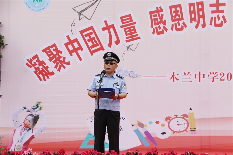 木兰派出所所长慕伟警官、石板滩街道关工委执行主任李泽忠、常务副主任吴贵章率领关工委班子成员及“五老”宣讲团成员应邀来到了开学典礼现场,他们鼓励同学们锤炼道德修为、努力学习,希望他们成为志存高远、道德高尚的有为青年。