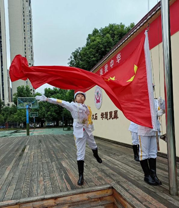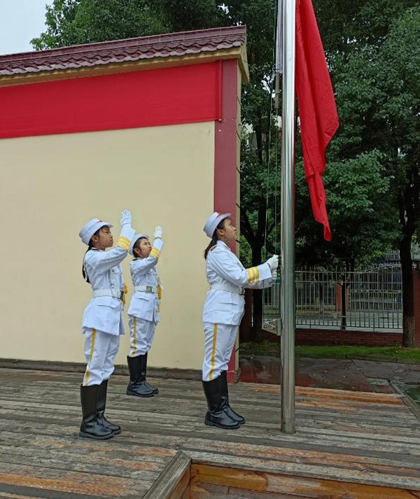 伴随着庄严的国歌奏响,鲜艳的五星红旗冉冉升起,全校少先队员立正,敬礼!