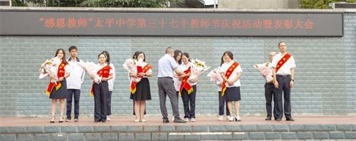 上午10时,教师节庆祝大会在运动场热烈召开。胡友洲校长亲自给获得市级、区级荣誉称号和突出贡献奖的老师们颁发证书,赠送鲜花。胡校长以诚挚的话语向老师们致以节日的问候与祝福。