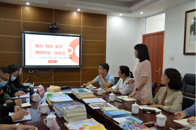 鄢光文校长首先就作业减负和课后延时服务分享了学校的认识与做法,强调减负并非一减了之,减的是量,加的是质;减的是标,加的是本。接着东一课程管理中心主任陈晓玲就学校作业管理进行了题为《敢为 智为 实为 做好作业“加减法”》的专题交流。她从制度管理和具体实施两个方面展开:学校要让作业总量做减法,让作业质量做加法,通过建章立制、探索“举手”机制、共享资源来加强作业制度管理,确保减负增效;聚焦作业设计、布置、批改、讲评四环节,落实五育并举。