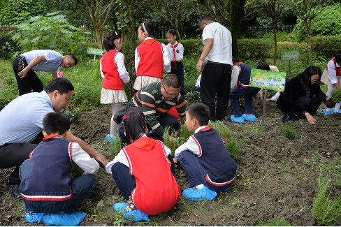 最后,大家来到了东一北校区,北校区聂品主任介绍了北校区中医药文化特色课程。 一行人来到中医药文化实践基地--百草园,和少先队员们一起将迷迭香、茼蒿草等中草药种在了潮湿的泥土里,也将五校同盟的友谊种子种在了每个人的心里。