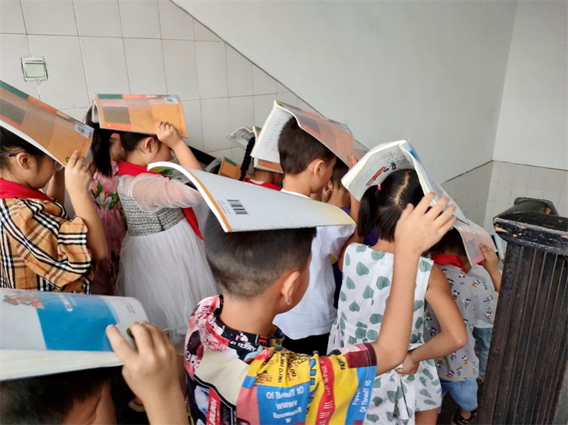 学校发出疏散信号时班主任按照小组安排疏散顺序,带领学生按照疏散路线迅速、有序地疏散。动作要领:(1)学生从教室疏散时应从前后门同时疏散;(2)在走廊,学生应双手交叉或用书本等物品护住头部,快速前进。(3)通过楼道时可直立行走,保持动作。不交谈、打闹、嬉戏。楼道右边学生出门后,靠楼道右侧有序撤离;楼道左边学生出门后,靠楼道左侧有序撤离。只许出不许进。(4)班主任在队伍前面,配班老师在队伍后。(5)到达前操场,学生下蹲,用双手交叉或用书本等物品护住头部,并即使清点了本班人数。