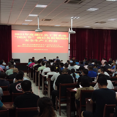四川新闻网成都9月28日讯 为扎实做好“国庆节”前后及假期期间安全生产工作,全面提升全县工贸企业安全管理水平,有效防范化解重大安全风险,2021年9月26日,蒲江县应急管理局联合县经科信局组织全县280余家工贸企业召开“国庆节”前后及假期期间安全生产工作部署会。