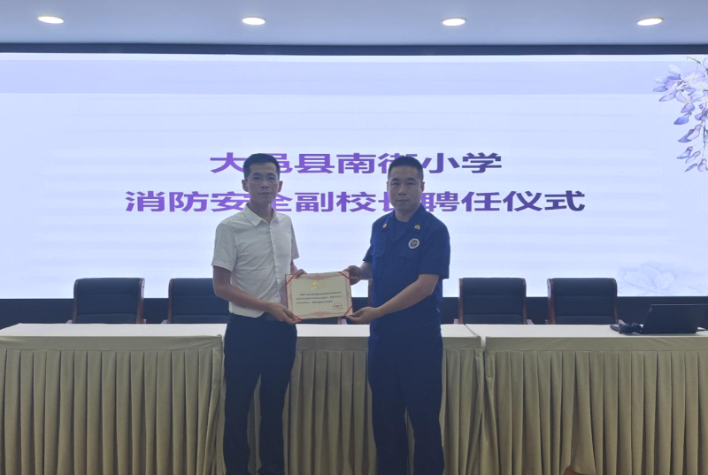 副校长秦旭首先致欢迎辞,衷心感谢大邑县消防救援大队曾鸿全同志应邀参加此次活动,并代表学校向曾鸿全同志颁发“大邑县南街小学消防安全副校长”聘书。