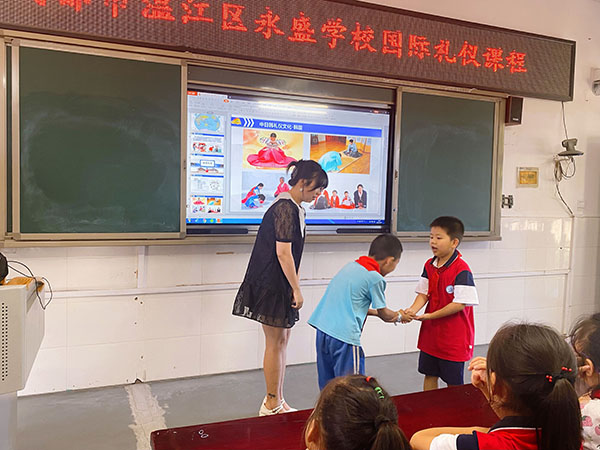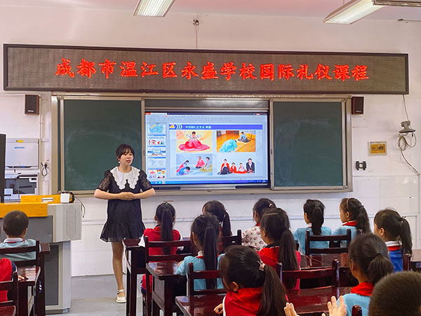 四川新闻网成都9月29日讯 成都市温江区永盛学校素来以“礼文化”教育著称,“知礼、明礼、习礼”是每个学子的必修课。为让本校学生在学好中国传统礼仪文化的同时,了解与学习更多其它国家的礼仪文化,永盛学校于9月28日下午1:50特邀请四川少儿电视台“阳光起跑线”的主持人钱亚男,为本校三年级的孩子们上了一堂中日韩国际礼仪课。