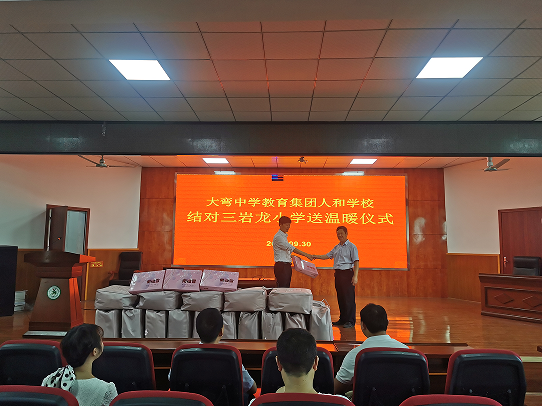 仪式伊始,庄福贵校长为三岩龙小学送上温暖的问候,表达了促进两校教育教学资源共享和共同发展的美好愿景。接着刘国庭主席代表工会介绍物资(毛毯、棉手套)捐赠情况,为三岩龙小学师生送上实实在在的温暖。庄福贵校长亲手将毛毯、棉手套赠予支教副校长陈吉金,并合影留念。