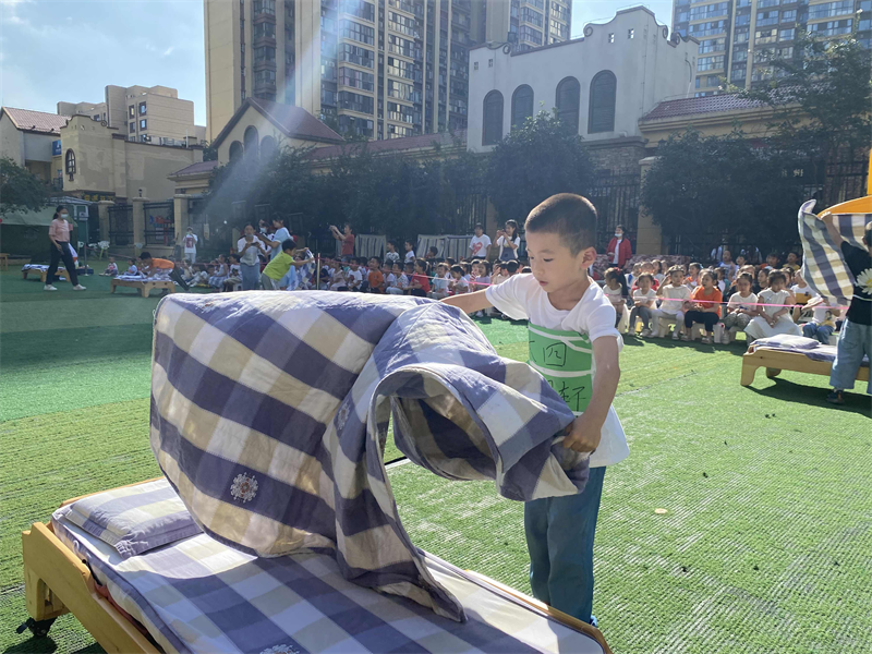 劳动比赛开始前,孩子们和老师一起用律动拉开劳动竞赛的帷幕。大班比赛项目为整理书包和打包被子;中班比赛拧毛巾和翻裤子;小班比赛使用勺子和正确接水的方法。比赛场上热闹非凡,孩子们紧张而不慌乱,场下观战的老师和小朋友们都紧张地为小朋友们加油。