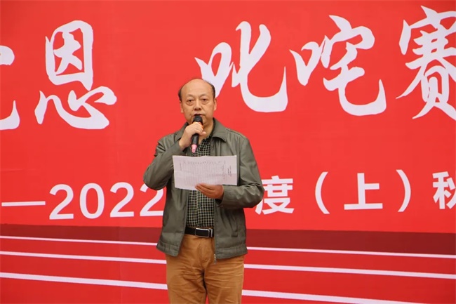 本届运动会裁判长孙瑞老师宣布“入场式”、自编操、运动成绩团体名次和道德风尚奖的评选结果。