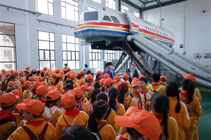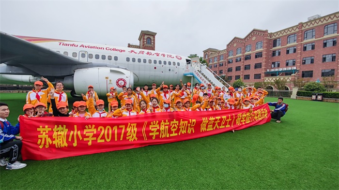 四川新闻网成都10月18日讯 “这个学校好漂亮啊!”“原来飞机有这么大!”“这个游泳池里面还有飞机!”近日,天府新区航空旅游职业学院好不热闹!美丽的校园迎来了苏辙小学2017级的上千名孩子们,开启一场以“学航空知识做蓝天卫士”为主题的研学之旅。他们将在这里体验模拟飞行、高空撤离、水上撤离、实体飞机等民航体验项目,近距离了解了航空航天知识。