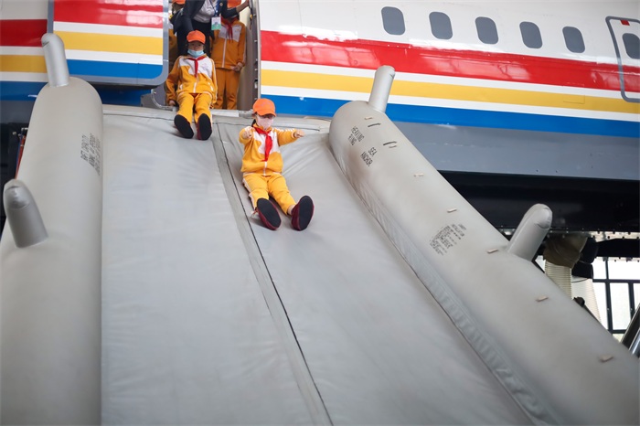 随后,同学们来到从荷兰进口的动态撤离实训舱,天航的老师给学生们介绍如何正确防冲击姿势,讲授防冲击原理,并在登机后通过飞机上下、翻转、俯仰等六个自由度体验,感受飞机起飞、颠簸、俯冲、水陆迫降等姿态。现场是惊叫连连,同学们大呼“过瘾”。在水上训练室的A320/A330出口模拟器前,实训中心的老师为同学们讲解了飞机在水上迫降后的撤离技能、海上求生技巧、游泳技能等,通过理论、实操演示学习,培养小朋友团结协作意识、求生意识和求生技能。