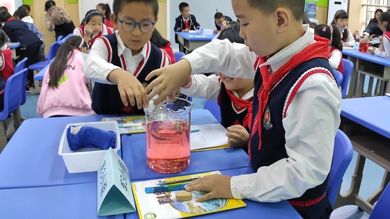 “大家听过乌鸦喝水的故事吗?”第二节课通过一则故事我们走进邱梦瑶老师精彩的课堂——《空气占据空间吗》。通过将木块放入水中及加入塑料瓶不同的现象,让学生建立空气占据空间的概念,通过实验验证“浸不湿的纸”。在这一基础上,进一步探究空气占据空间的大小是否会变化。邱老师的教学设计以任务驱动法展开,教学活动设计紧扣教学内容,由易到难、层层递进,引领学生有层次、有目的地探究。邱老师用“追问”的形式在学生的思维节点上提出“为什么”,根据学生的实际情况有效引导,充分促进学生的思维发散。