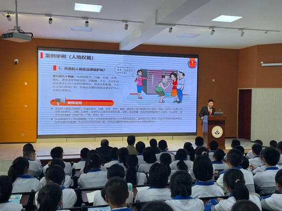 仪式结束后,孔云峰同志从专业角度给同学们作了精彩普法讲座。他带领同学们首先学习认识了新颁布的《民法典》 ,孔云峰同志形象地把《民法典》形容成保护自己孩子的母亲,在温柔中带着包容,从人的出生到去世,无人不受母亲无微不至的呵护;将《刑法》形容成父亲,在威严中透露着慈祥,时刻纠正惩罚犯罪的人,维持正常的社会秩序。随后,孔云峰同志还例举了社会生活中不少生动有趣、贴近学生实际的案列,比如胎儿遗产继承、网络虚拟财产、婚姻家庭关系、未成年人保护等实际案例,与同学们分享,受到大家欢迎。