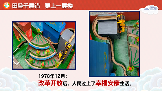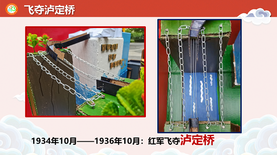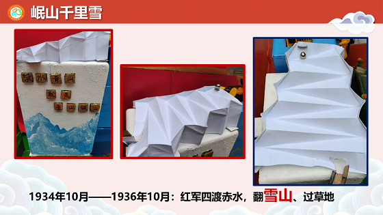 过山车全程共七处历史还原景观,设计时,教师团结合发生于各关卡的真实历史事件及其特点,为每个关卡都设置有独特而诗意的名称。分别是“星火始红船”“岷山千里雪”“飞夺泸定桥”“旭日东方红””田叠千层错”“更上一层楼”及“红星耀中华”。