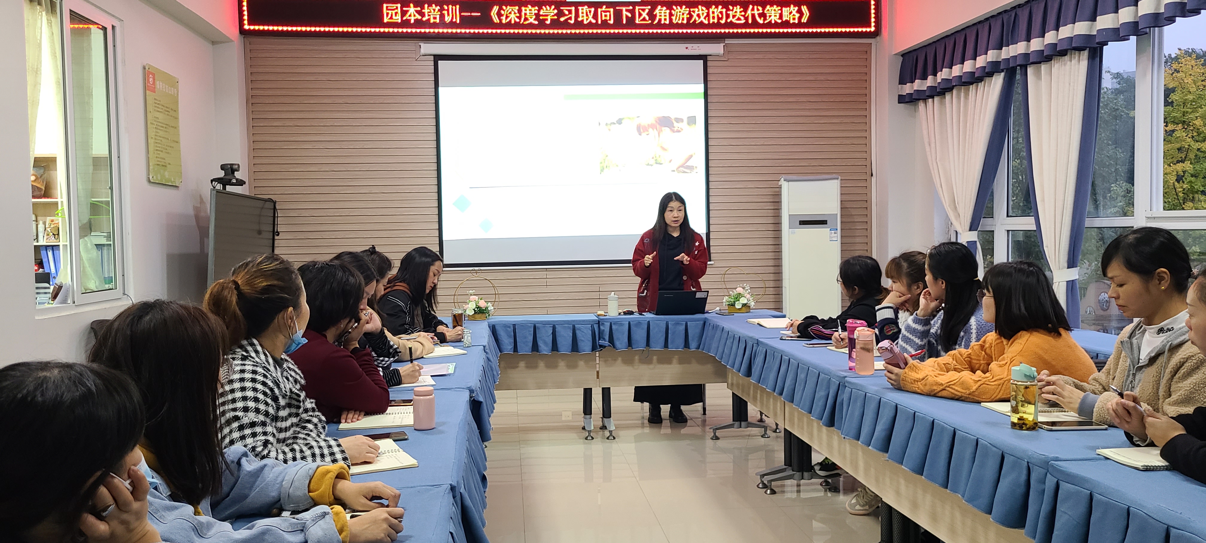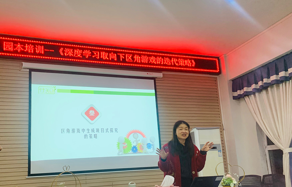 区角游戏是幼儿园游戏化课程的重要组成部分,是幼儿游戏、学习不可缺少的活动。为了进一步提升区域活动的质量,满足幼儿个性化的需要,陈琳督学给全园教师进行了以“深度学习背景下区角游戏意义化迭代的实践策略”为主题的专题培训。