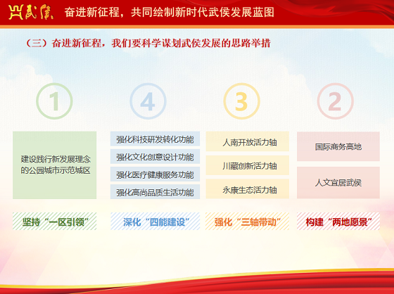 奋进新征程、实现新发展。未来5年,武侯区将坚持“一四三二”发展思路。坚持“一区引领”,始终锚定建设践行新发展理念的公园城市示范城区的奋斗目标。深化“四能建设”,强化武侯科技转化基地、创意设计基地、健康服务基地、品质生活基地四个方面城市功能。强化“三轴带动”,构建人民南路、川藏路、永康路三轴辐射带动全区高质量发展的空间格局。构建“两地愿景”,围绕构建“国际商务高地·人文宜居武侯”,打造立足成都、服务成渝、辐射全国的国际化现代化商务高地和具有区域文化特色的美好生活承载地。